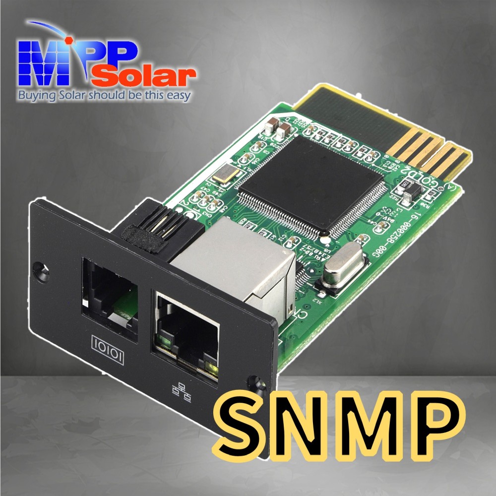 The module comes in two parts — SNMP Box and SNMP card. Models that come with an “intelligent slot” (such as MPI hybrids) may use the card directly simply by inserting the card into the slot. For most other inverters models without the slot the box option is required and connection is made through the RS232/RJ45 com port. For USB port models without RS232 com port, an adaptor PCB can be supplied to facilitate the conversion upon request.